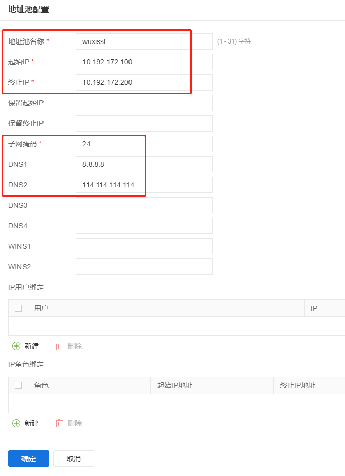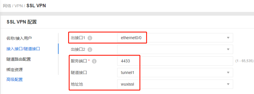 【接入接口/隧道接口】配置中,出接口选择绑定了公网IP地址的Ethernet0/0,服务端口使用4433,隧道接口使用刚才创建的tunnel1,地址池使用新建的地址池。