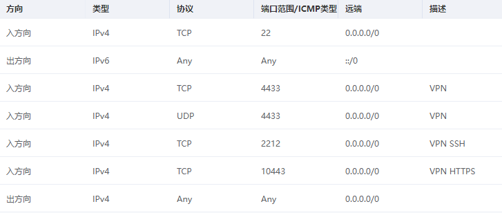 放行TCP 4433端口和UDP 4433端口,用于建立SSL VPN的隧道连接;放行TCP 2212端口,用于登录防火墙命令行。