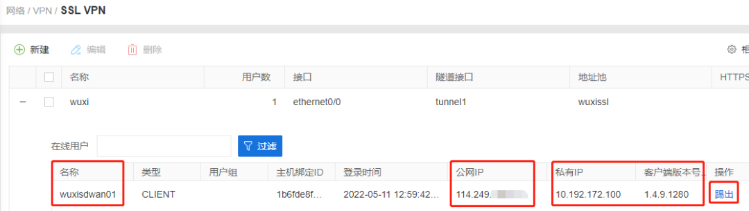 从VPN网关中可以看到用户的登录状态,并且可以将用户踢下线。