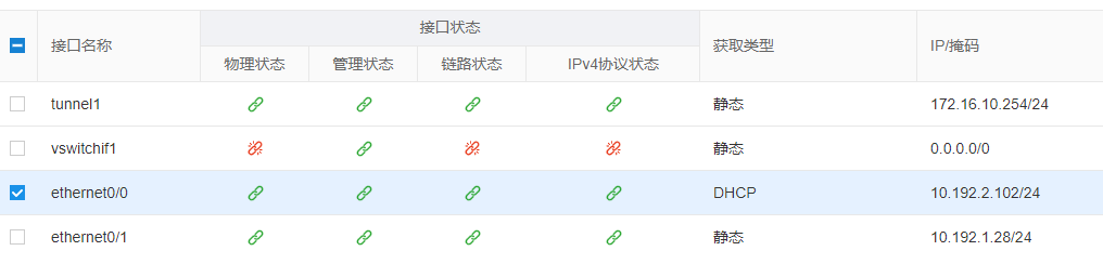 在【网络】→【接口】下面,可以看到网卡信息,其中ethernet0/0是绑定公网IP地址的网卡,ethernet0/1是和vCPE通信的网卡。