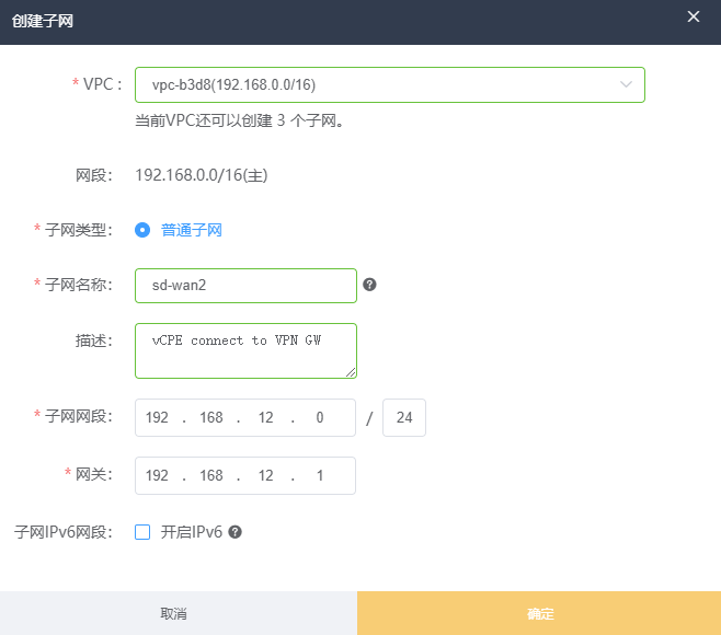 再新建一个192.168.12.0/24的子网2,供VPN网关和vCPE主机进行互通,并提供访问互联网的能力。