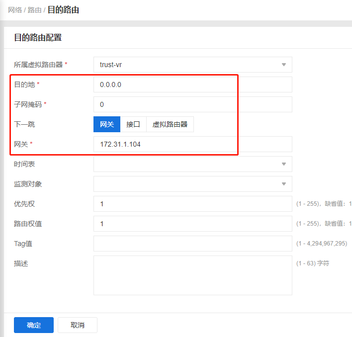 确认可达之后,在【网络→路由→目的路由】中添加一条默认路由,下一跳指向vCPE的互联地址。
