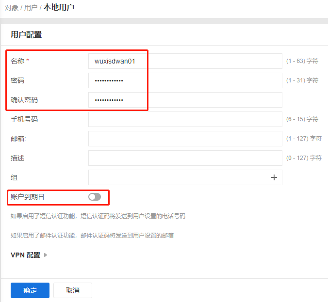 配置用户的名称和密码信息,视情况配置【账户到期日】,如果配置了账户到期日,则在账户到期日之后。账户将变成锁定状态,无法登录。