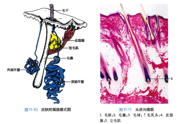 人体皮肤上包括头发在内的所有毛发,虽然长短、粗细、颜色、形态各不相同,但基本结构都是一样的。如图,汗腺负责排汗,皮脂腺负责分泌油脂润泽毛发和皮肤,竖毛肌决定毛发的方向,而毛囊,则是所有毛发的起点、温床和永远回不去的故乡。