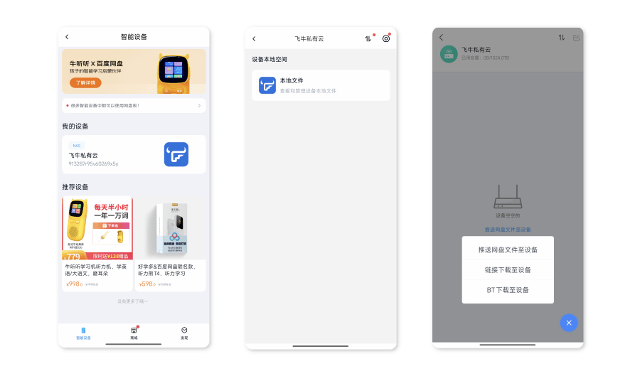 此外,飞牛私有云与百度网盘互联功能还包括提供移动端智能设备管理、一键推送至网盘、一键下载至NAS设备等便捷功能,进一步提升了用户的使用体验。
