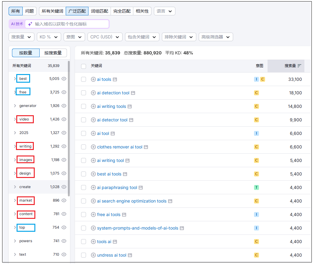 红框:选定的关键词 video,writing,images,design,这些关键词是与ai tools 这个关键词高度相关的一些词。