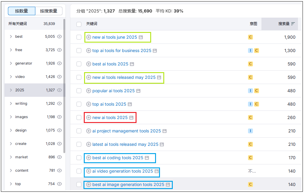 这样我们就合理的整理出与2025 ai tools 相关性的专题页面词库与板块分类,为后续运营打下基础。