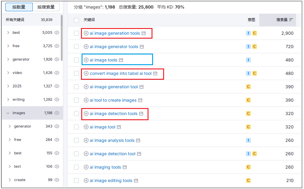 举个例子:当我们检索 ai image 这个词的时候,精选如下关键词