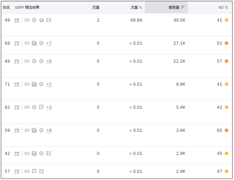 我们可以优选KD难度比在60以下,搜索量50K以下的关键词,排名起来相对会容易一些。