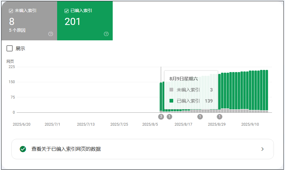 截止:9月18日,页面索引量201个,8个页面未被索引。