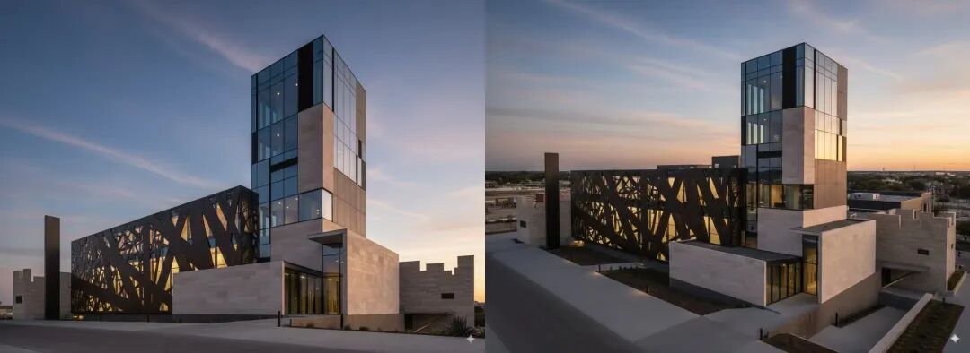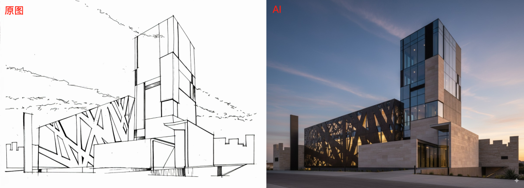 英文:Convert the picture into a real architectural effect drawing. The structure of the building is consistent with the original drawing, in a modern style, with genuine materials. At dusk, the light is transparent and natural, the sense of space is strong, and the details are complete