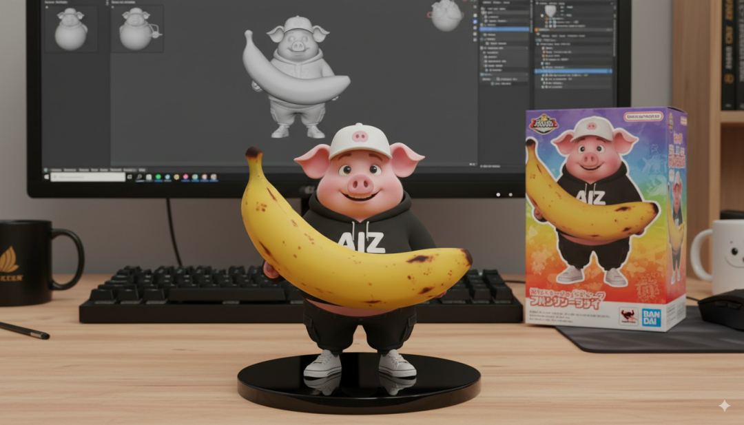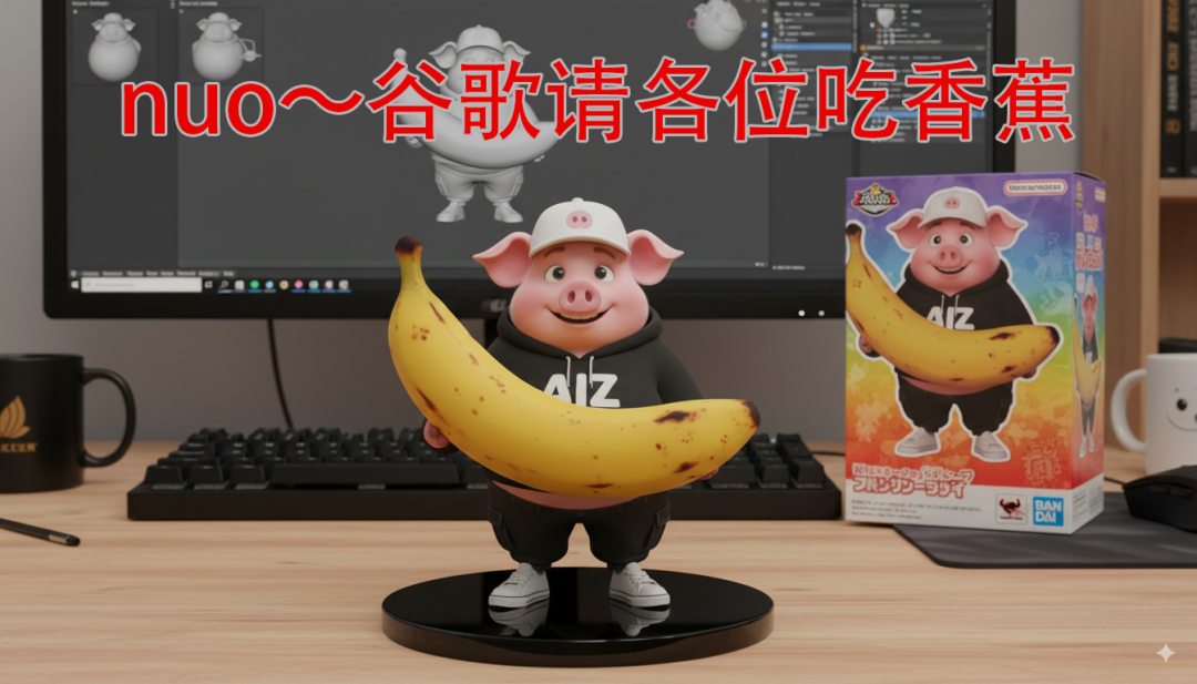 英文:In a realistic style environment, create a 1/8 scale commercial 3D figurine based on the image of a little pig in the picture. Place the figurine on the computer desk, using a round black acrylic base without any text. Display the ZBrush modeling process of the graphics on the computer screen. Beside the computer screen, place a Bandal-style toy box printed with original artwork
