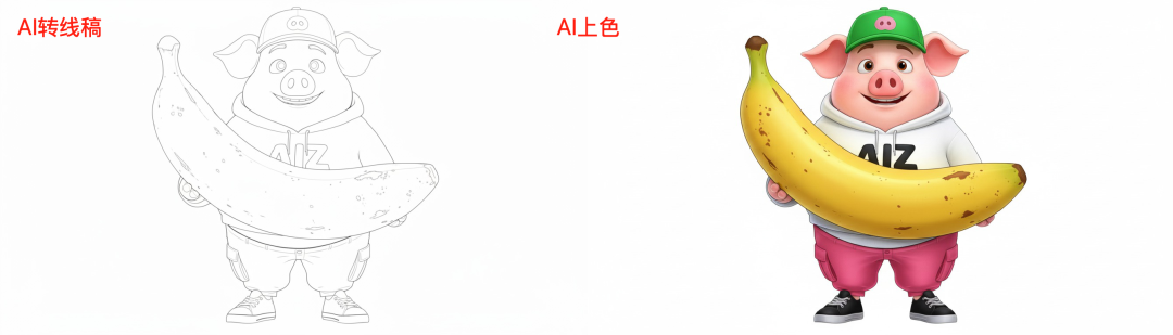 英文:This photo is of an IP character. Please keep the outline of the original drawing consistent and color this drawing. The color matching should be of high quality, with a natural and textured effect, and the overall picture should have rich colors and diverse styles. The hat is required to be green, the sweatshirt is white, the trousers are pink, the shoes are black and the background is white