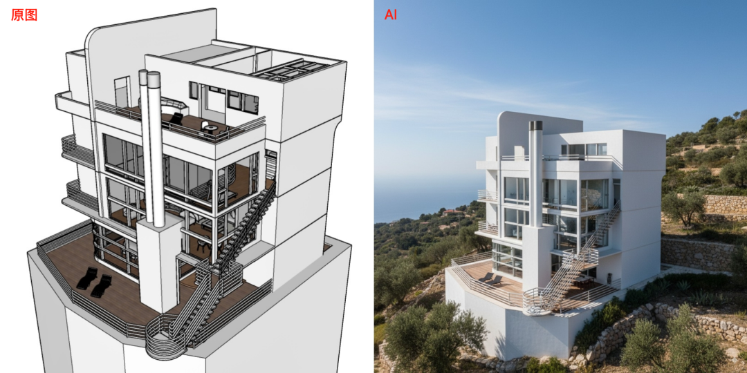 英文:Convert the pictures into real architectural photographs. Please refer to the original drawing for the basic color scheme. The architectural structure should be consistent with the original drawing. The overall lighting is natural, with rich details, and it is complemented by an environment that blends well. White School architectural style. This building is located on the hillside