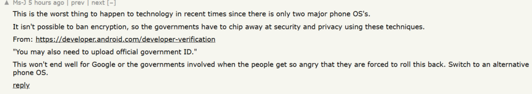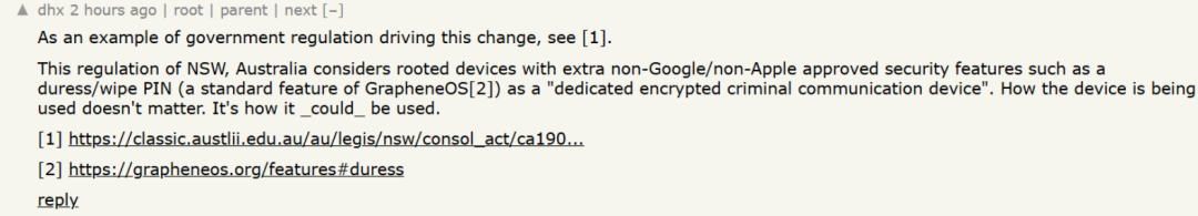 “看看澳大利亚新南威尔士州的法律:带有非谷歌/非苹果批准安全功能的 root 设备(如 GrapheneOS 的‘胁迫 PIN’功能)会被认定为‘加密犯罪通信设备’,即便设备主要用途完全合法。”(编者注:该法案实际强调真实用途,但还是引起了功能合法但被当作“犯罪工具”的担忧)