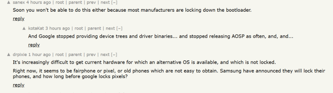 越来越难找到可刷机的硬件,似乎只剩 Fairphone、Pixel 或旧手机,三星宣布会锁机,谷歌未来会不会也锁 Pixel?