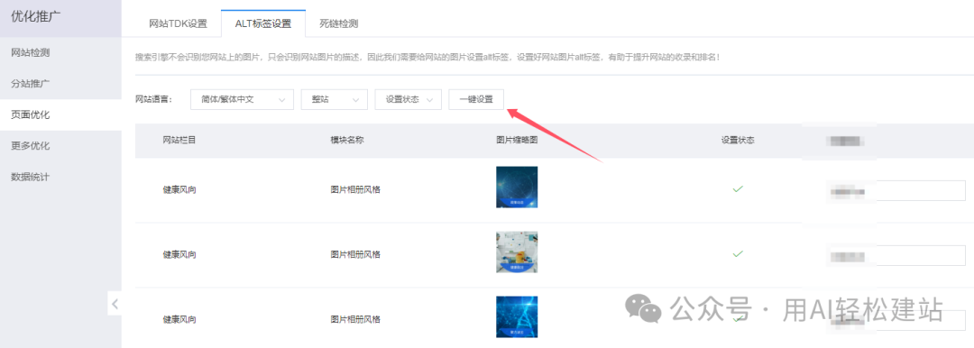 给网站的图片都取一个对应的名字,以便搜索引擎更好的识别它,图片的名称最好可以结合网站关键词一起,这样被搜索和命中的几率更高,后台也可以支持快速一键设置。
