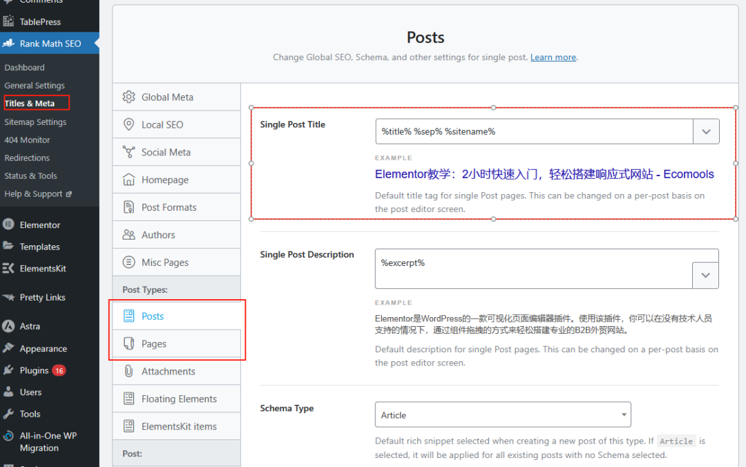 通过Rank Math SEO > Titles & Meta 这里,可以设置各类页面的标题格式。