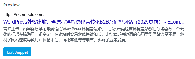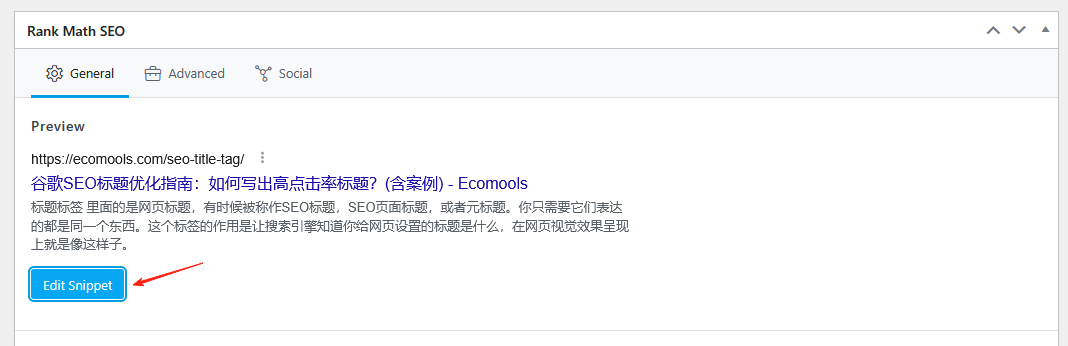 这个是需要额外注意一下的,可以使用RankMath来评估我们的标题是否过长,打开单个页面的编辑界面,然后在最下面找到RankMath模块,点击“Edit Snippet”即可。