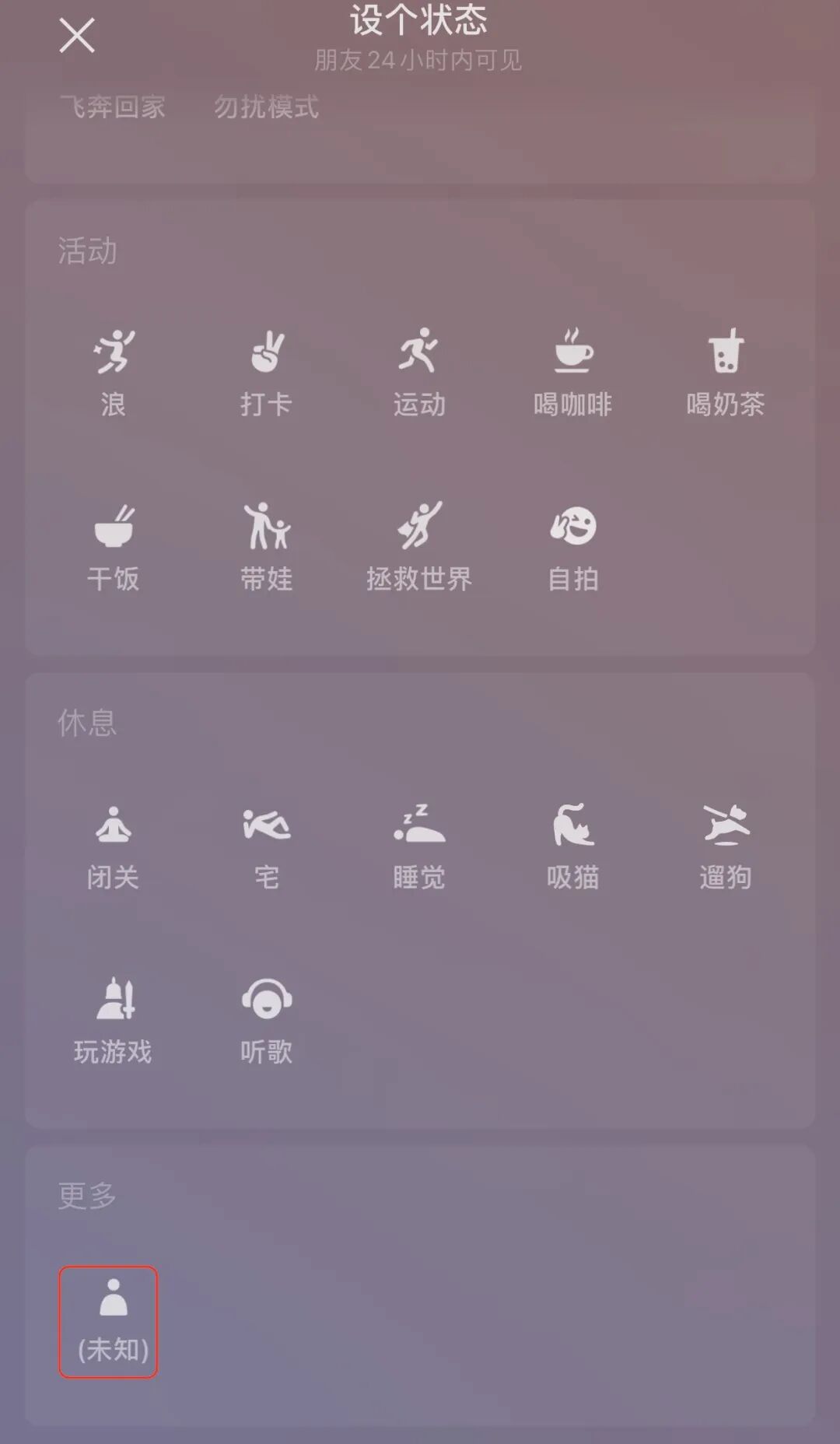 打开微信,右下角“我”点击上面“+状态栏”,拉到最底有个“未知”点击进去