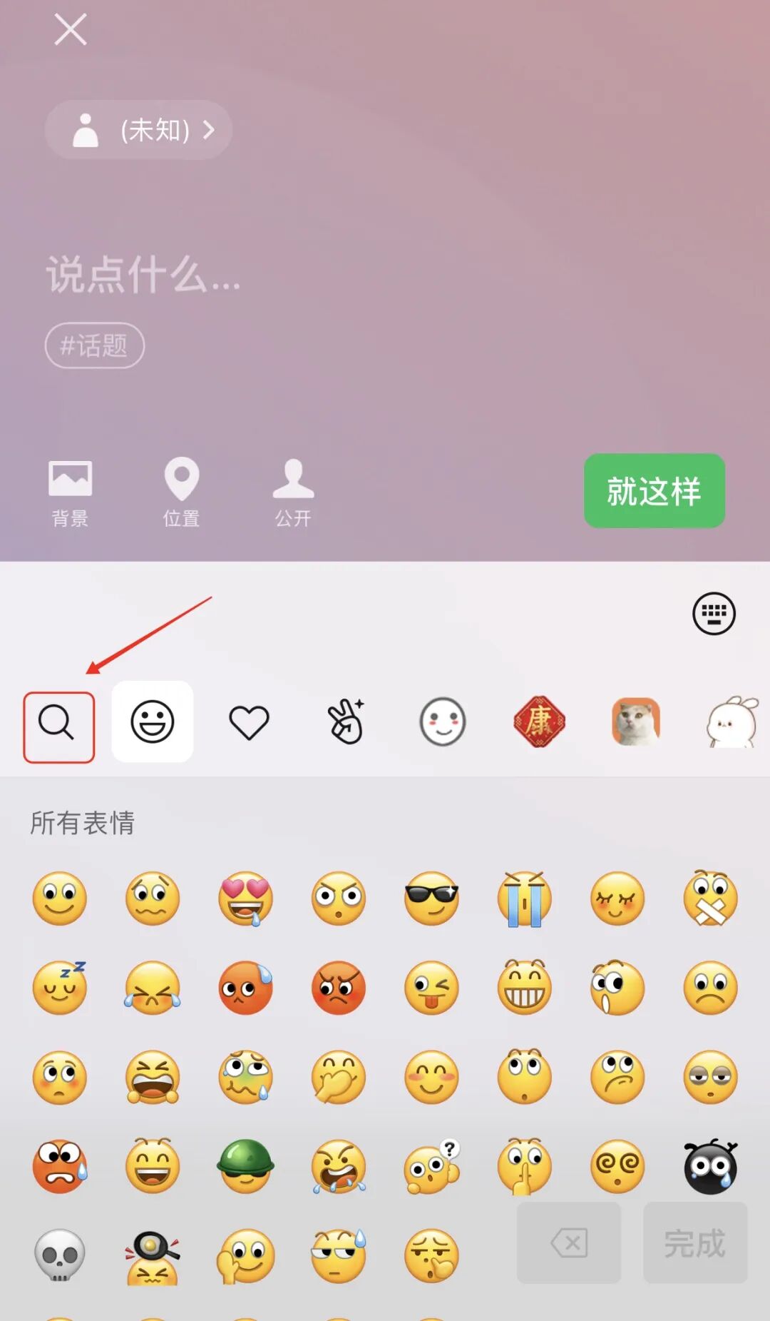 键盘右上角点击“笑脸”小图标,然后点击左下角“🔍”搜索小图标
