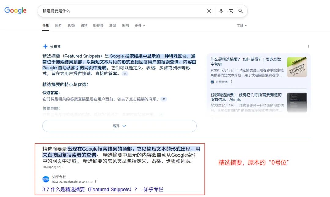 但是自从谷歌推出AI概览之后,多数场景下AI概览会在最上方;与精选摘要常见共存,如下图: