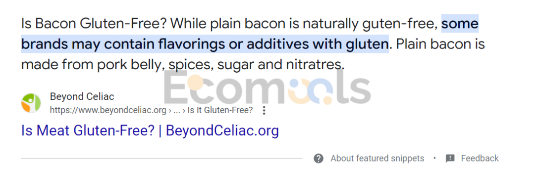 但是相对的一点,对于简短的用户查询,如果用户在0号位获取到了相应的信息,就不会点击进入到网站之中,常常是看完就走。比如常见的这类查询:is bacon gluten free。如下图: