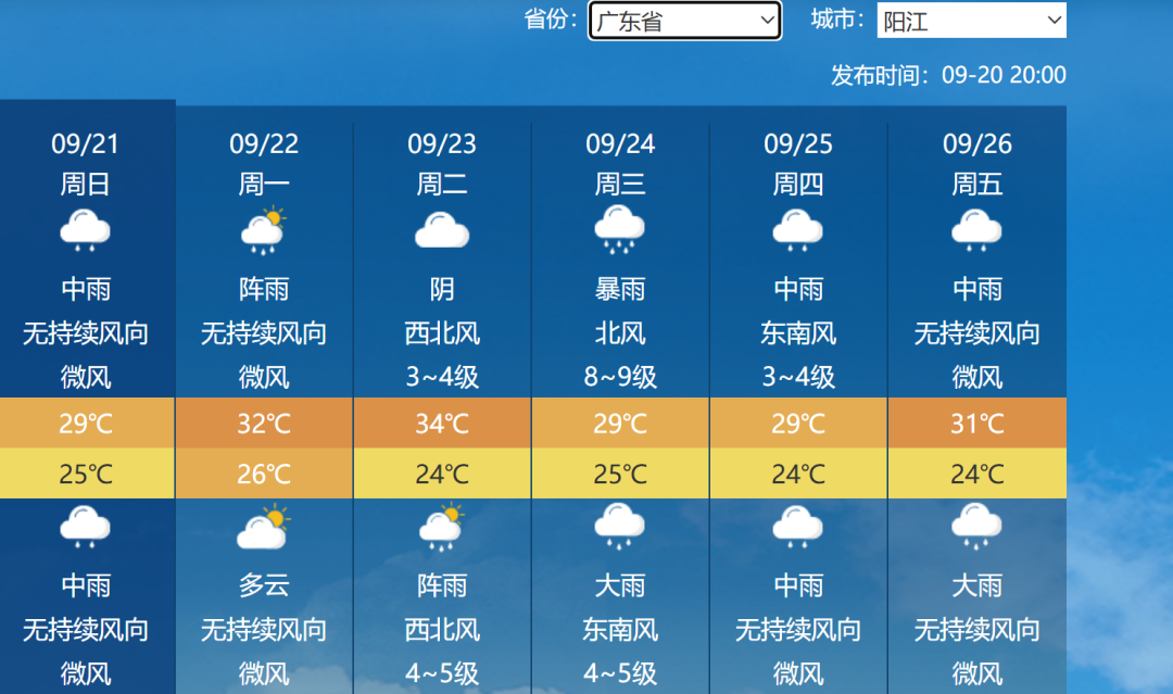 21日,粤西、珠三角、清远市县中到大雨局部暴雨;其余市县有阵雨局部大雨。最高气温:梅州和粤东市县33~36℃,其余市县29~32℃。